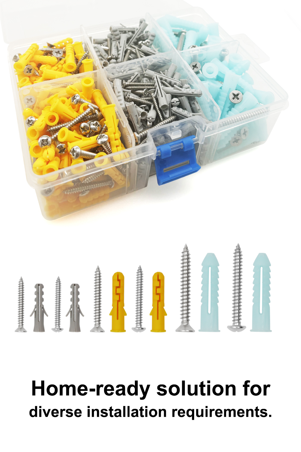- [Screws with anchors drywall set] Includes 216 drywall screws and 216 drywall anchors. Offering anchor sizes of 0.20" x 0.98", 0.24" x 1.18", and 0.31" x 1.50", paired with corresponding screws of 0.12"x0.98", 0.16"x1.18", and 0.20"x1.57".